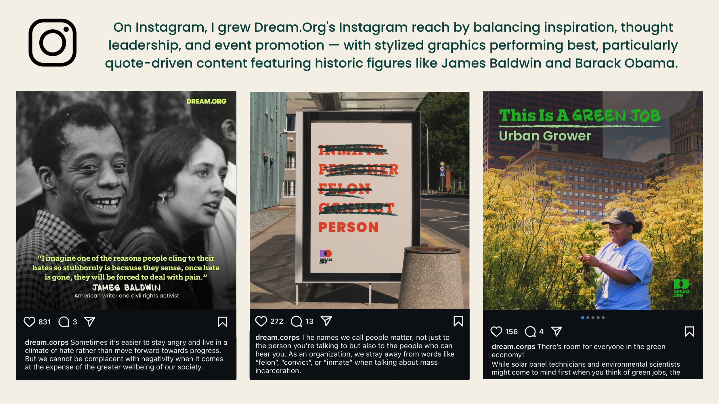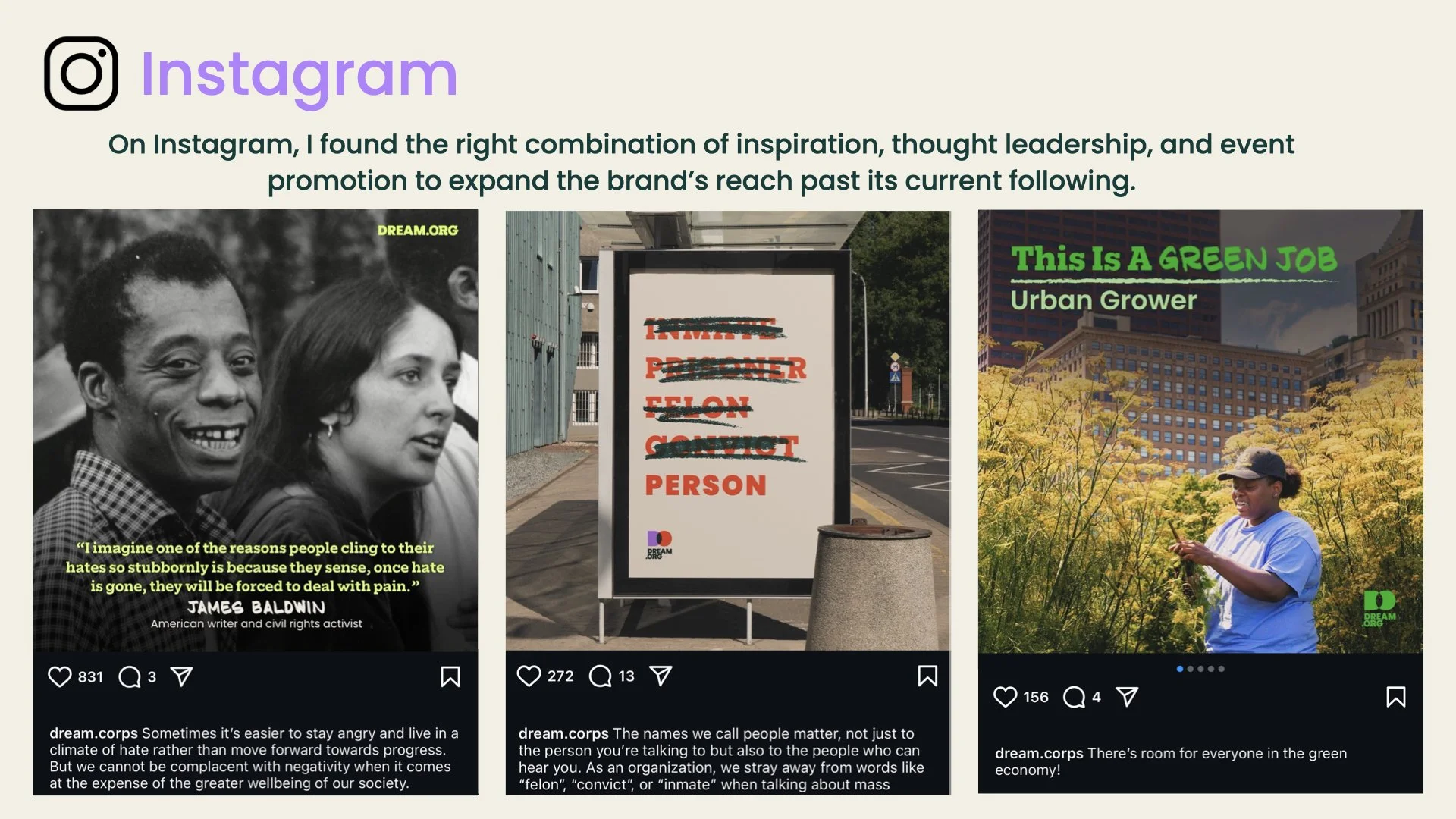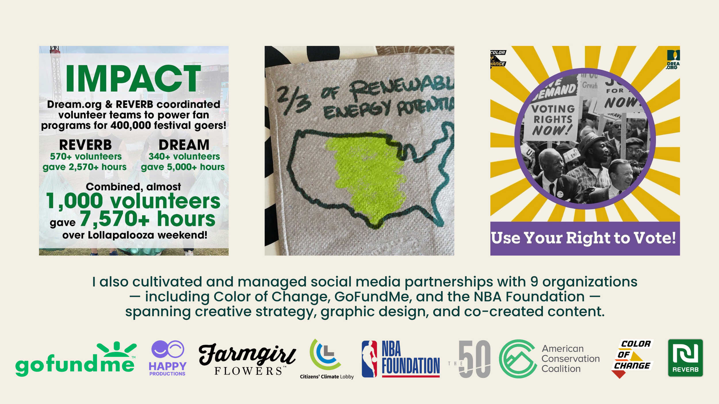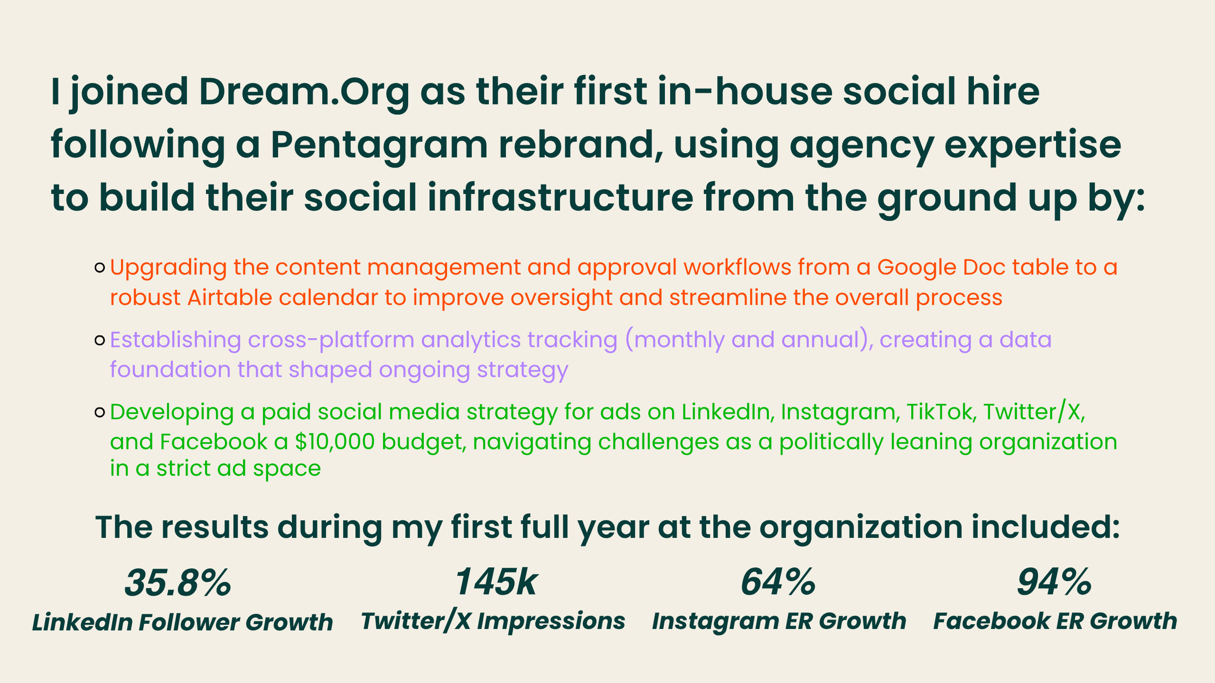 In 2.5 years at Dream.Org as a social media manager, I successfully used my marketing skills for good to promote a pro-social nonprofit organization and bring people together around a theme of community. From innovative social media strategy to digital ads to analytics management, I did it all while promoting a world with dignity and equity for all.