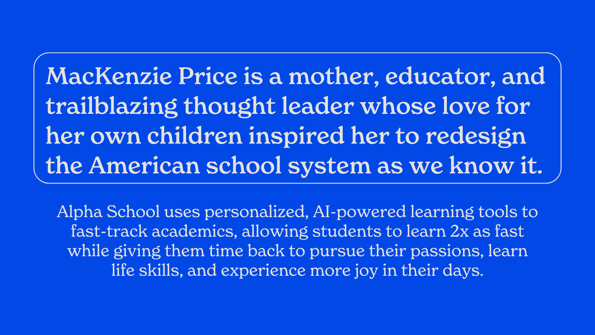 MacKenzie Price is a mother, educator, and trailblazing thought leader whose love for her own children inspired her to redesign the American school system as we know it.