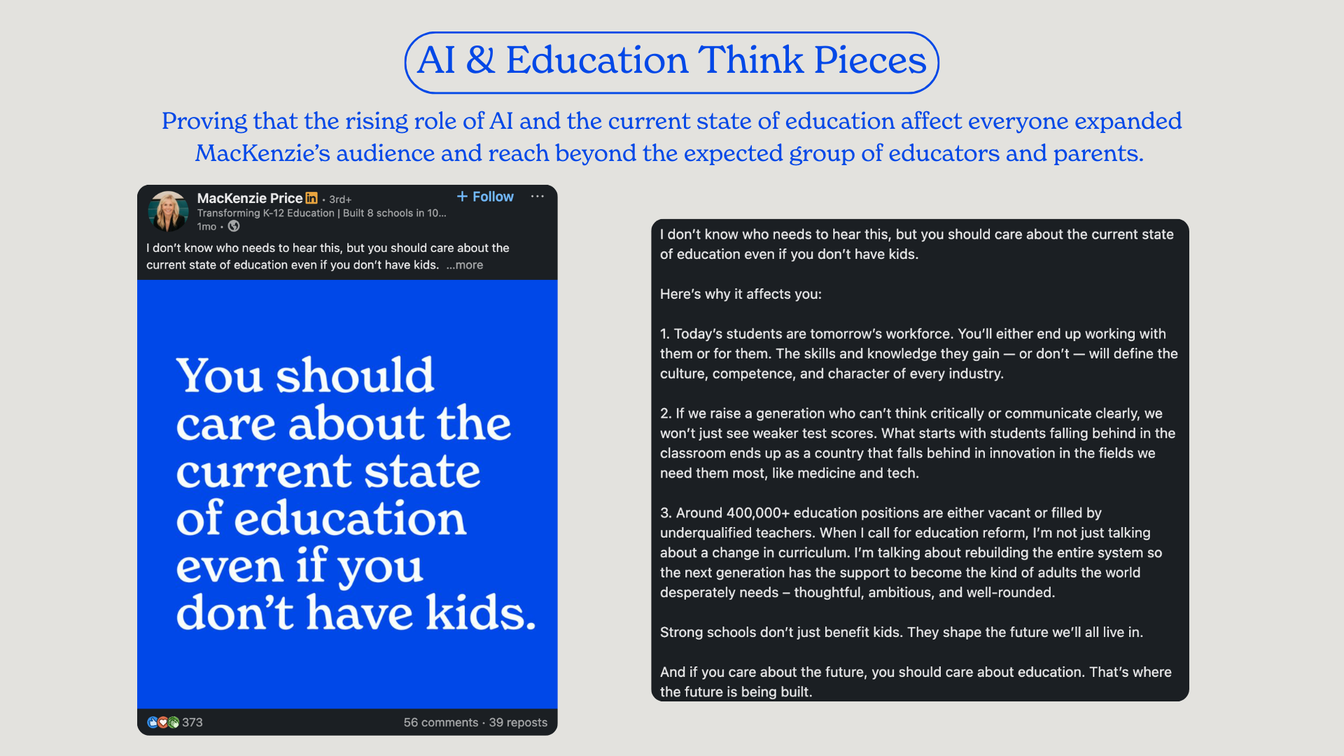By combining a deeply human mission with a thoughtful, comprehensive content strategy, I successfully transformed an innovative educational model and MacKenzie Price’s role in it into a national conversation.